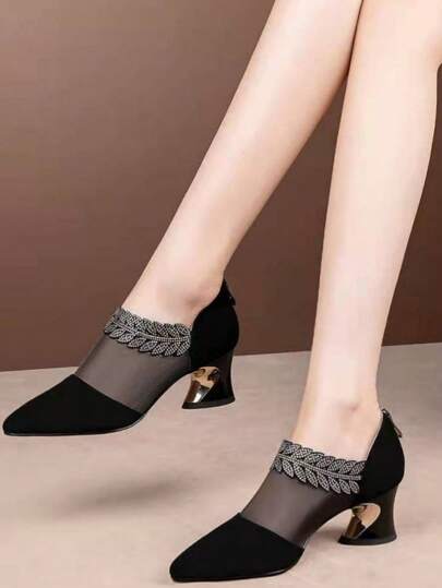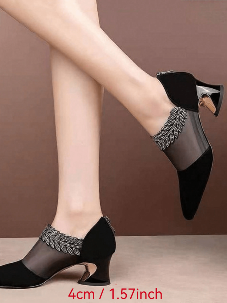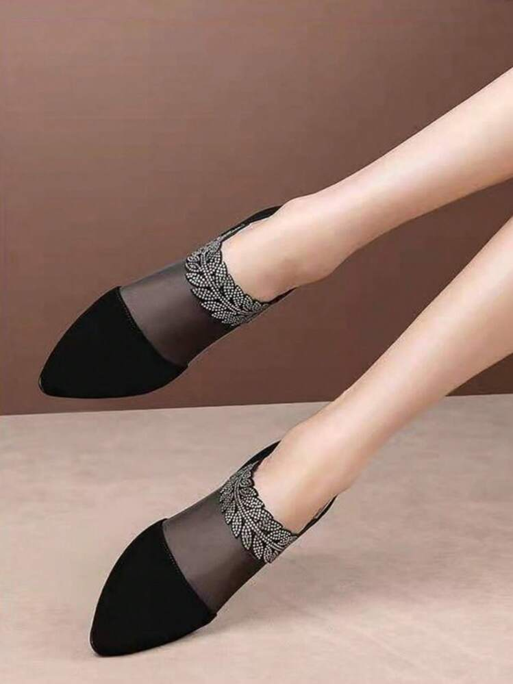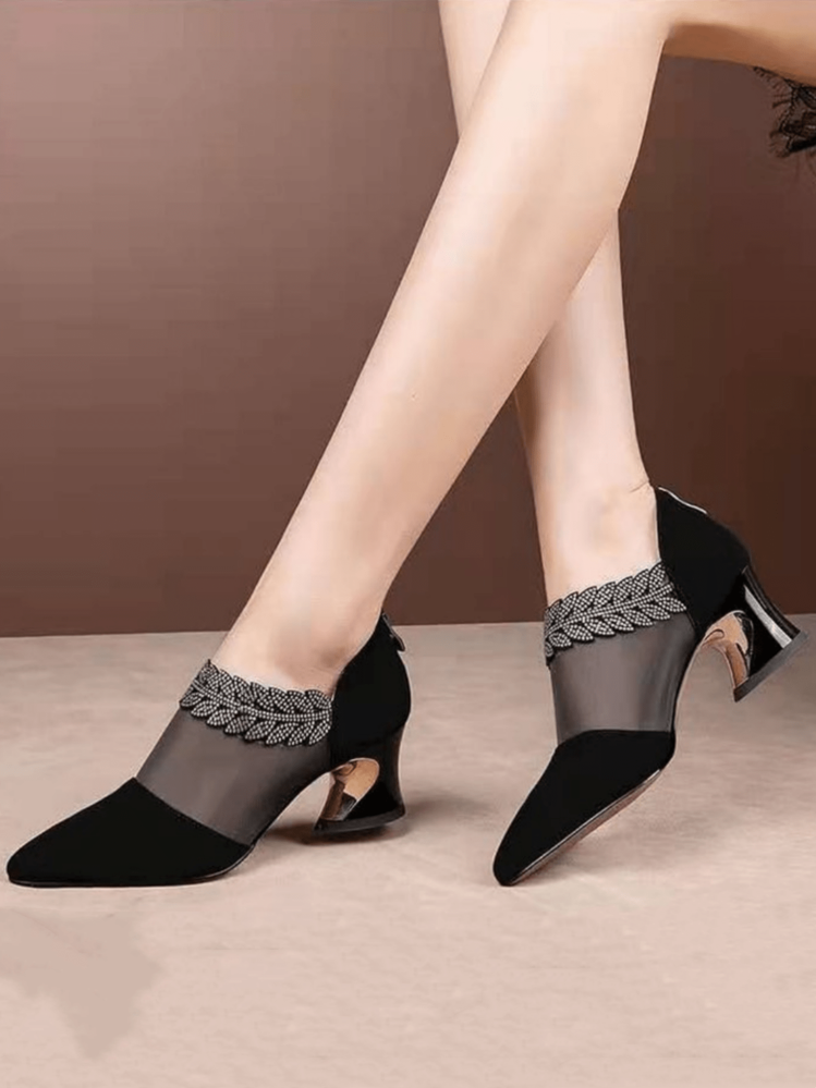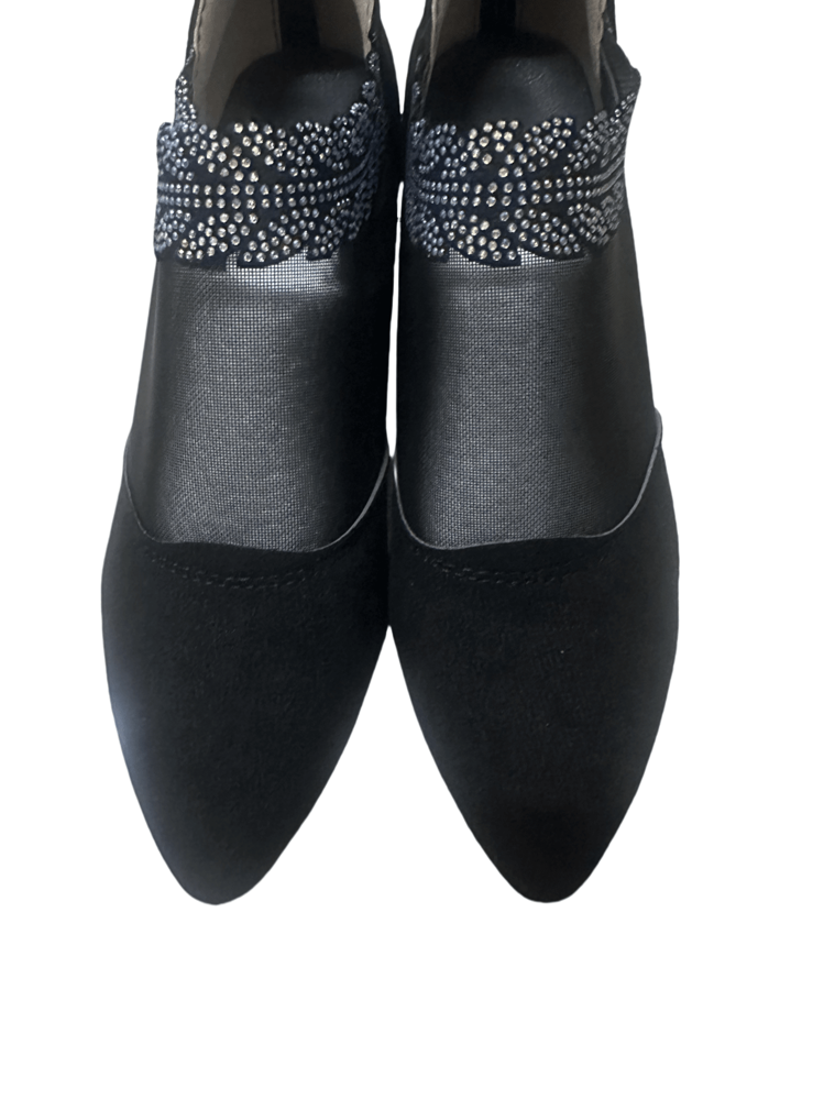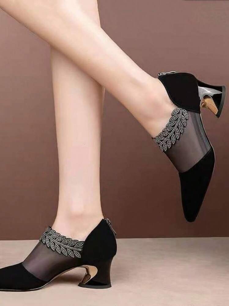 تميّزي بإطلالة فاخرة مع هذا الحذاء النسائي المصمم بأسلوب أنثوي راقٍ. يأتي بلون أسود أنيق مع مقدمة مدببة وكعب منخفض مريح، ويزدان بتفاصيل شبكية ناعمة عند أعلى القدم، تتوسطها زخرفة متألقة من الأحجار البراقة على شكل أوراق لامعة، تمنحه لمسة فريدة من الفخامة والأنوثة.